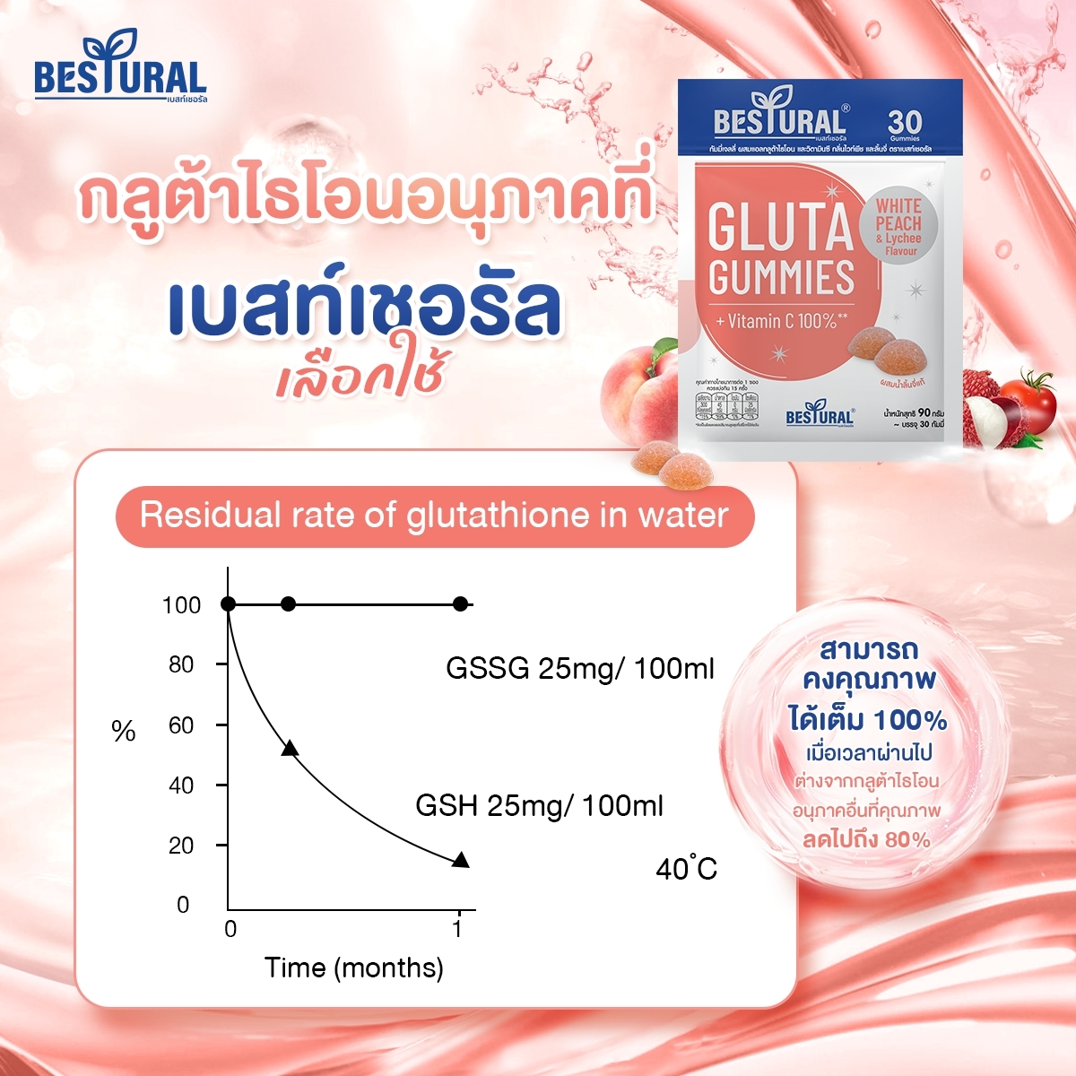 Bestural Gluta Gummies ใช้กลูต้าไธโอนรูปแบบ “Oxidized” มีคุณสมบัติสำคัญ คือ ไม่มีกลิ่นเหม็น ไม่ตกค้างในร่างกาย และคงคุณภาพได้นาน