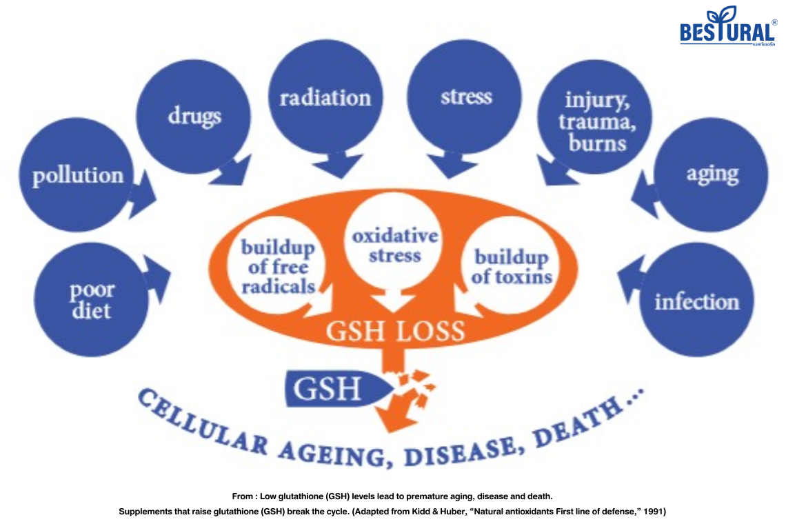 กลูตาไธโอนเป็นสารต้านอนุมูลอิสระที่เซลล์ในร่างกายมนุษย์สามารถสังเคราะห์ได้เอง โดยในเซลล์ทุกเซลล์ในร่างกาย ซึ่งถูกผลิตมากที่สุดที่ตับ ปอด ไต ม้าม ตับอ่อน และเลนส์แก้วตา แต่ปริมาณการสังเคราะห์กลูตาไธโอนในร่างกายจะมีความเปลี่ยนแปลงไปตามอายุ รวมถึง กิจกรรมการใช้ชีวิตประจำวัน เช่น เมื่อมีอายุที่มากขึ้น ปริมาณกลูตาไธโอนที่ร่างกายสังเคราะห์เองได้ก็จะน้อยลง โดยมีการศึกษาวิจัยพบว่าเมื่อย่างเข้าอายุ 20 ปี ปริมาณกลูตาไธโอน ในร่างกายจะลดลงเฉลี่ย 8-12% ต่อ 10 ปี แต่หากร่างกายมีการบริโภคยา หรือเคมีมากเกินไป ปริมาณการลดลงของกลูตาไธโอนในร่างกายจะลดเร็วขึ้น